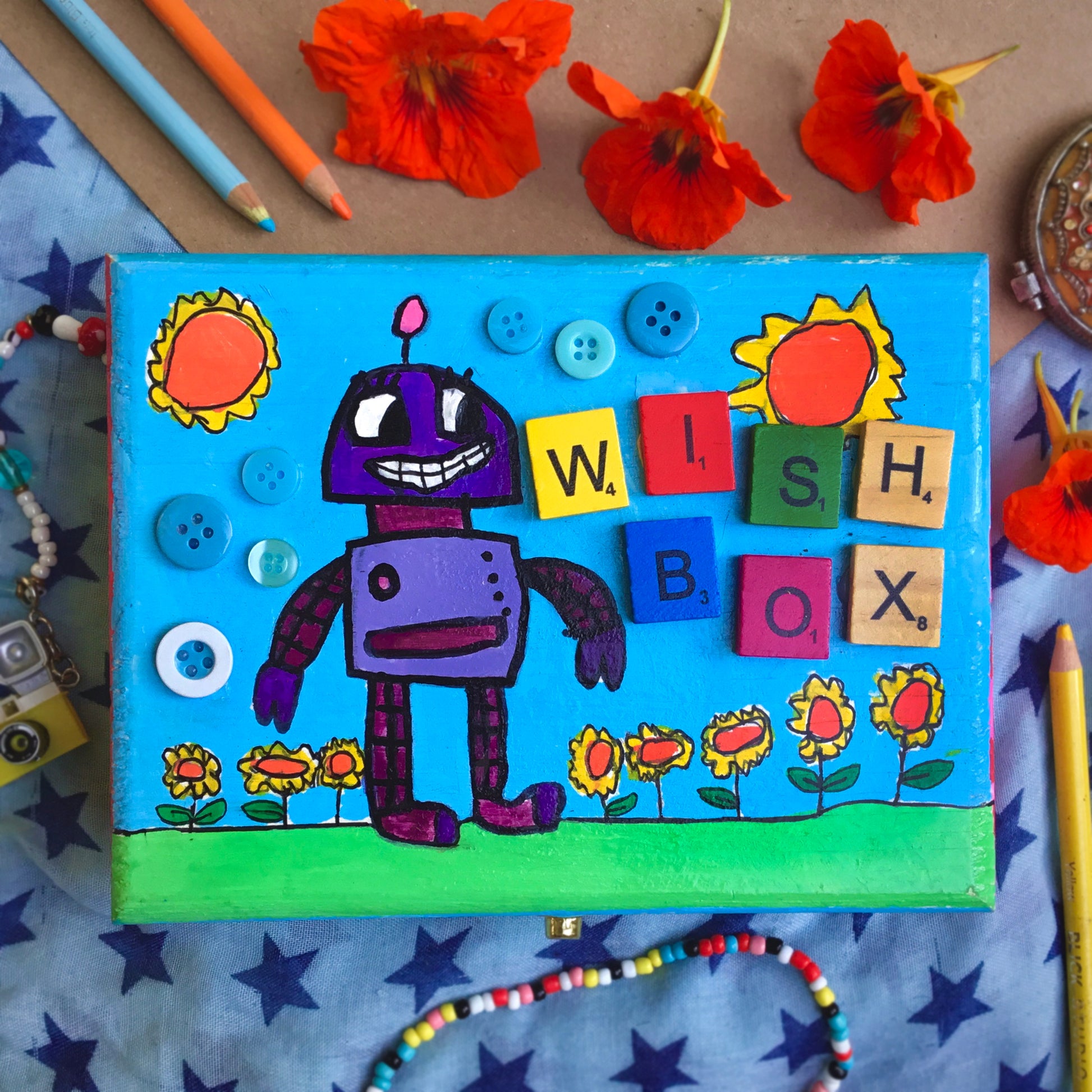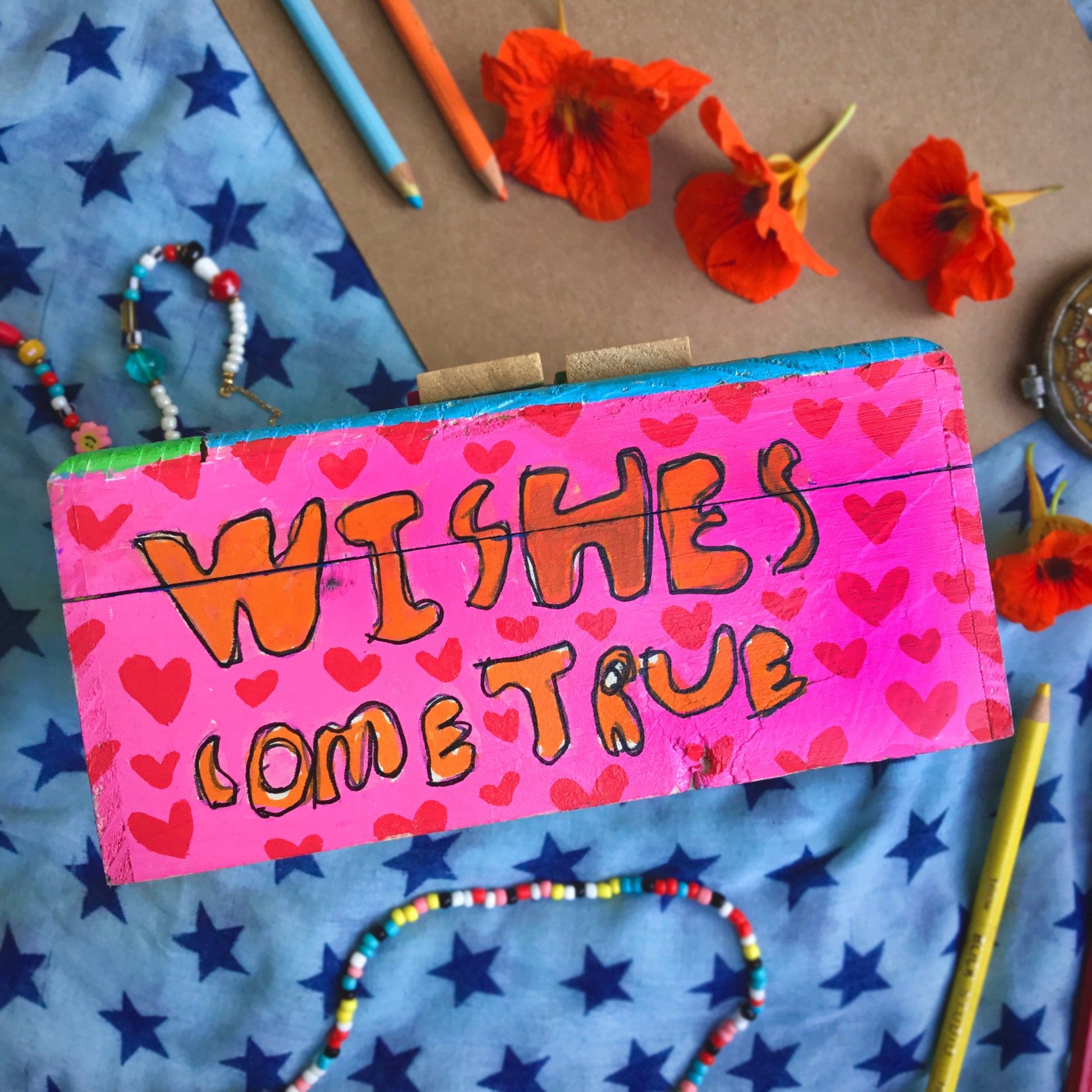 Wishes do come true! Artist Nick Akeson has made a series of hand painted wish boxes just for you. Write down your wishes and keep them in a box that's as special as you are. The outside and inside are painted with messages and cute creatures that'll bring you joy!