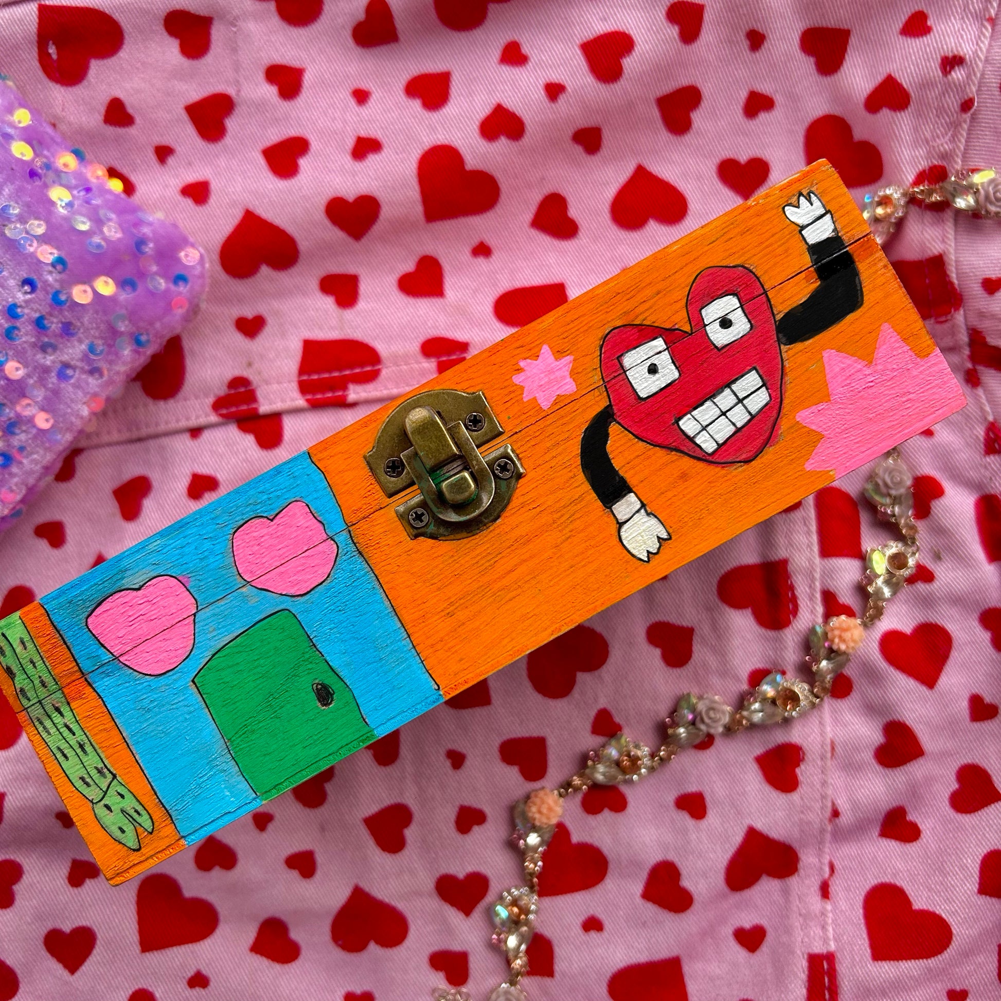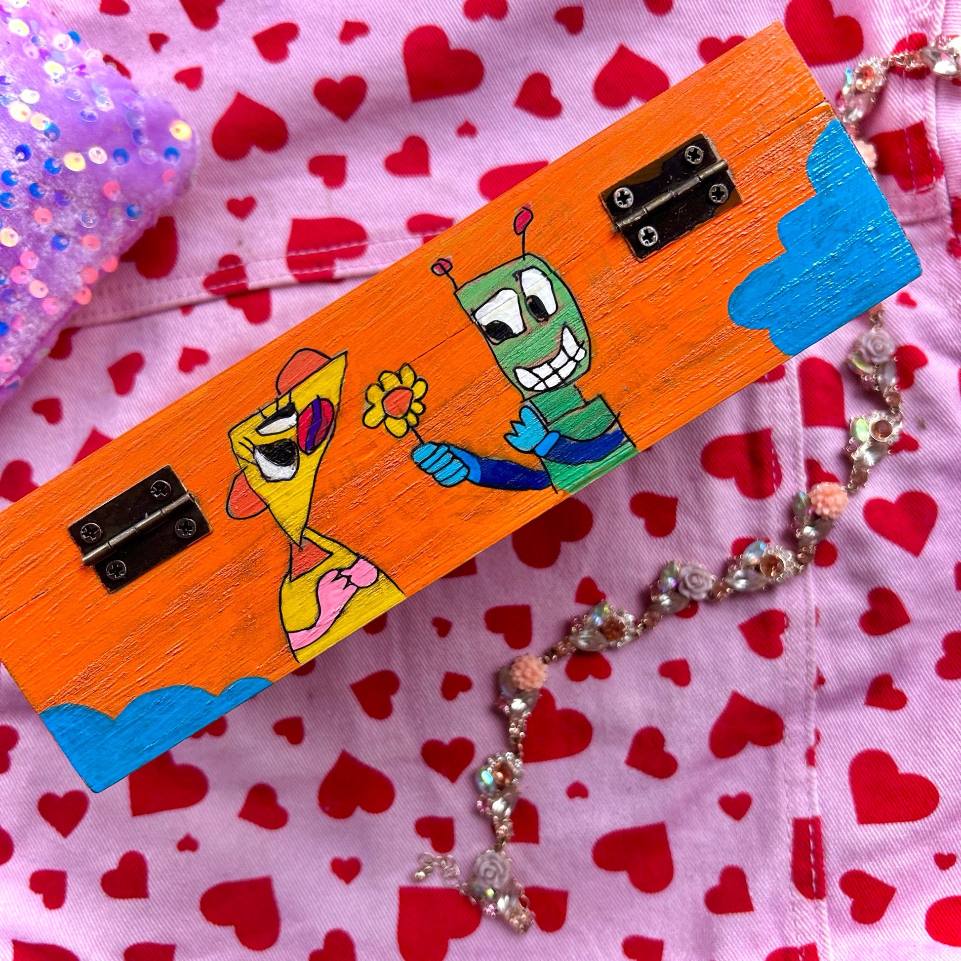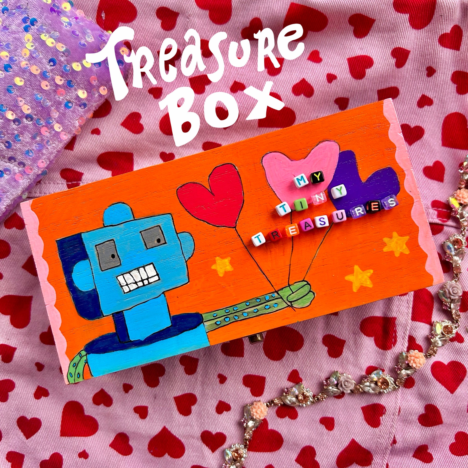This hand painted treasure box by Artist Nick Akeson is decorated with whimsical robot characters, glazed with resin, & adorned with colorful beads spelling "My Tiny Treasures".